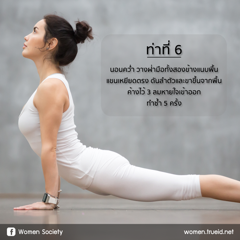 นอนคว่ำ วางฝ่ามือทั้งสองข้างแนบพื้น จากนั้นดันแขนเหยียดตรง ยกลำตัวและขาขึ้นจากพื้น ค้างไว้ 3 ลมหายใจเข้าออก แล้วกลับสู่ท่าเริ่ม
